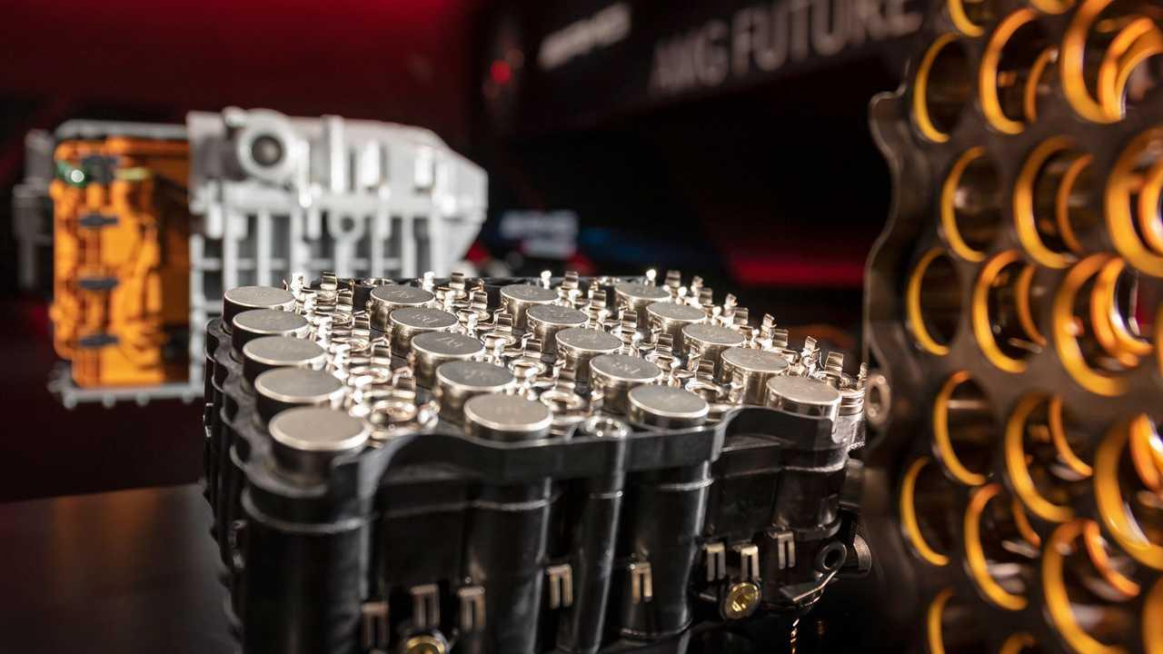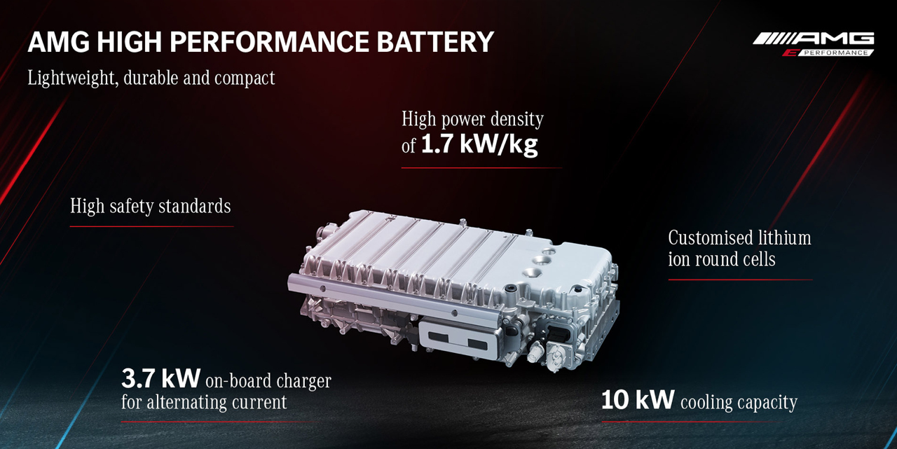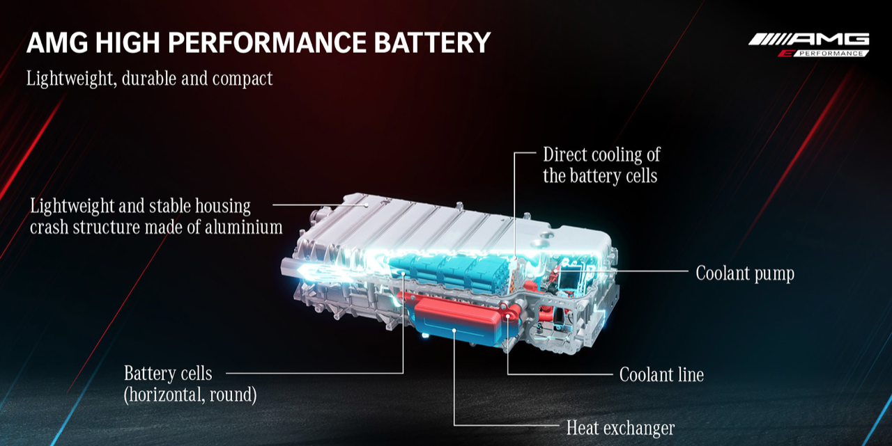 ส่วนหนึ่งของปริศนาในการขับเคลื่อนเครื่องยนต์ที่ติดตั้งระบบ Garrett E-turbo คือก้อนแบตเตอรี่ ตามข้อกำหนดของ AMG ที่มีกำลังต่อเนื่อง 70 กิโลวัตต์และกำลังสูงสุด 150 กิโลวัตต์ จากชุดแบตฯ ที่มีความจุเพียง 6.1 กิโลวัตต์ต่อชั่วโมง วิศวกรของ AMG กำลังผลักดันเซลล์แบตเตอรี่อย่างหนักมากถึง 70 กิโลวัตต์ เพื่อปรับให้สอดคล้องกับอัตรา C ประมาณ 11 คุณต้องการให้เซลล์แบตเตอรี่ของคุณอยู่ได้นานที่สุด อย่าใช้อัตรา C ที่ 1 อัตรา C สำหรับแบตเตอรี่ เทียบเท่ากับ HP/L สำหรับเครื่องยนต์ ยิ่งสูงก็ยิ่งมีความเครียดในทุกสิ่ง และโดยทั่วไปแล้ว อายุการใช้งานจะสั้นลง การวิ่งที่มีอัตรา C สูงหมายถึงความร้อนสูง เหมือนกับการเพิ่ม hp/L จำนวนมาก ดังนั้นจึงจำเป็นต้องมีการระบายความร้อนอย่างมีประสิทธิภาพ และ Mercedes AMG กำลังใช้การระบายความร้อนด้วยการแช่ของเหลวโดยตรง ด้วยการออกแบบให้เซลล์แบตเตอรี่จมอยู่ในของเหลวอิเล็กทริก (ที่ไม่เหนี่ยวนำไฟฟ้า) นี่เป็นเทคโนโลยีแรกที่ออกสู่ตลาด ซึ่งอยู่ในรถยนต์ที่ผลิตในปริมาณน้อยนิดอย่าง McLaren Speedtail ซึ่งใช้ระบบระบายความร้อนด้วยของเหลวโดยตรง และ Faraday Future ที่ลงมือลงทุนพัฒนาเทคโนโลยีนี้เมื่อหลายปีก่อน แต่พวกเขายังไม่ได้ทำการเปิดตัวรถรุ่นใหม่แต่อย่างใดทั้งสิ้น