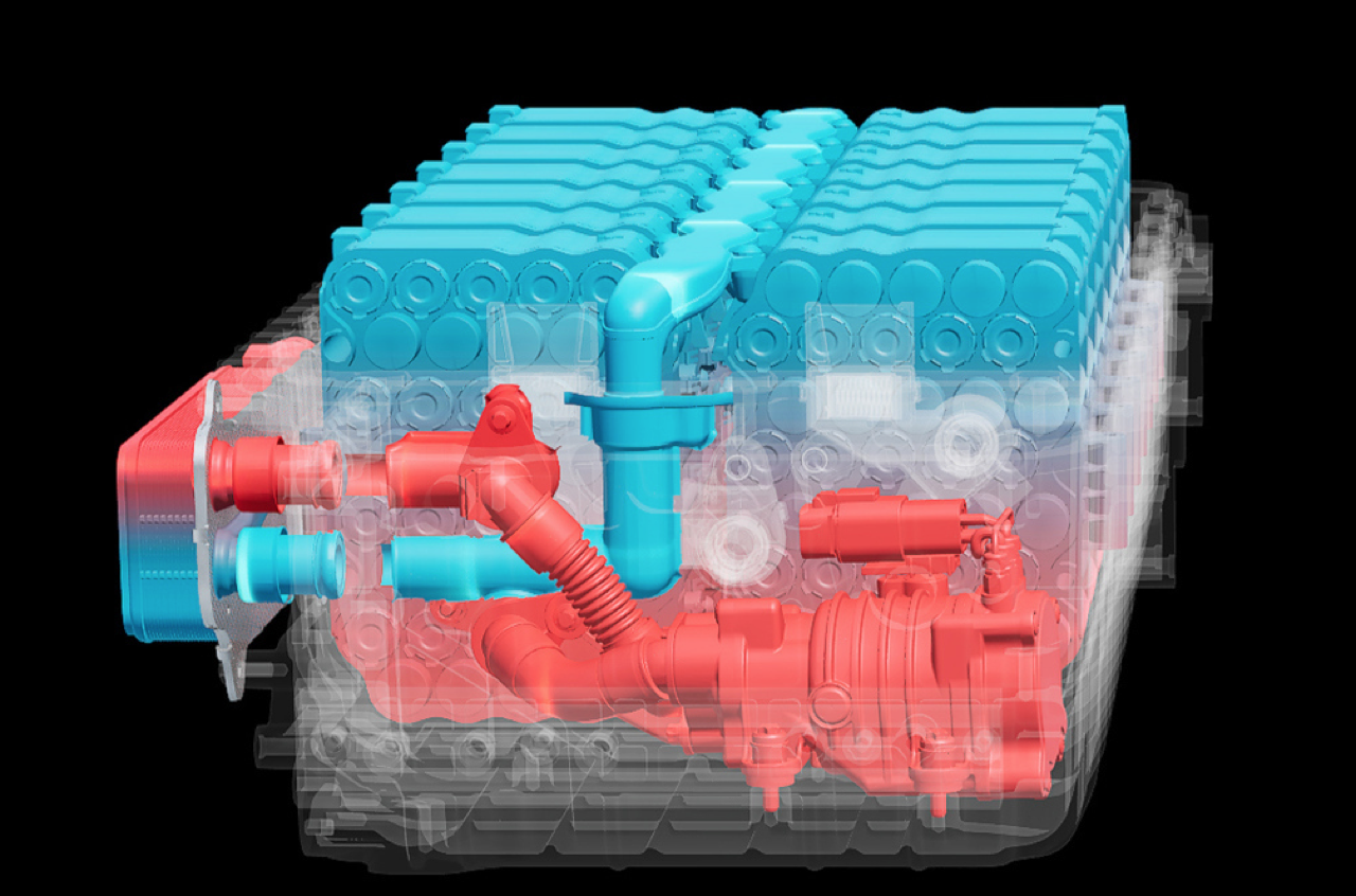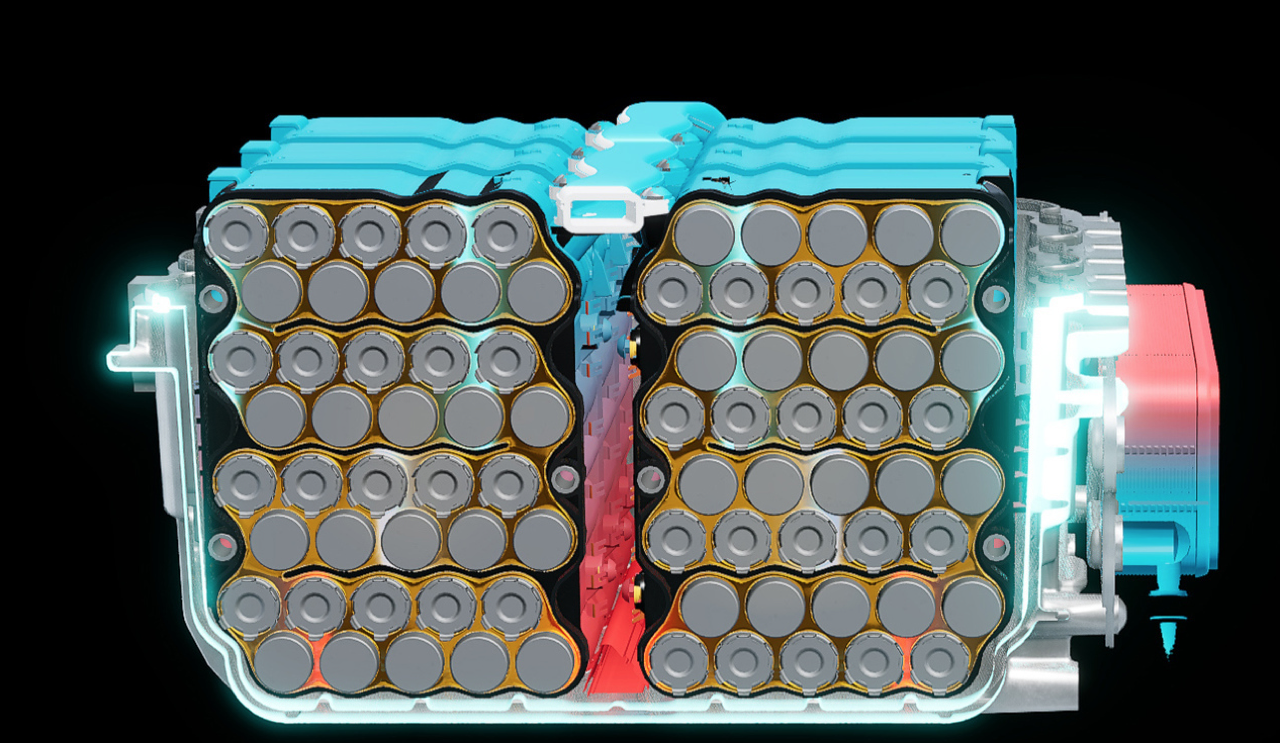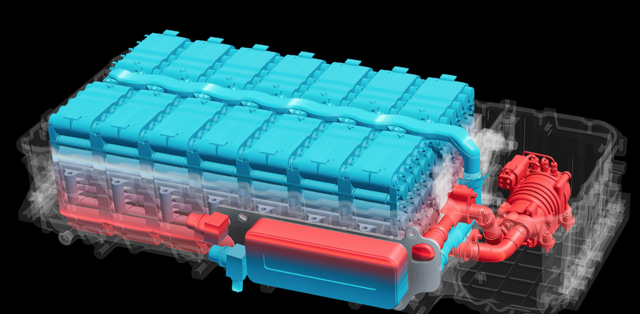ประโยชน์ของแนวคิดการทำความเย็นให้กับเซลล์แบตเตอรี่แบบแช่ของเหลว น้ำหล่อเย็นสามารถดูดซับความร้อนได้อย่างรวดเร็ว จากจุดร้อนใดๆ ในเซลล์แบตเตอรี่ และอาจป้องกันไม่ให้เซลล์เข้าสู่การแพร่ความร้อน หากเซลล์เข้าสู่โหมดระบายความร้อน สารหล่อเย็นสามารถดูดซับความร้อนและหวังว่าจะป้องกันไม่ให้เซลล์ข้างเคียงติดไฟ ปั๊มน้ำหล่อเย็นจะดูดน้ำหล่อเย็นแบตเตอรี่ที่ร้อนจากด้านล่างของช่องเซลล์แบตเตอรี่ จากนั้น จะสูบจ่ายน้ำหล่อเย็นไปยังตัวแลกเปลี่ยนความร้อนน้ำหล่อเย็นซึ่งเป็นน้ำมัน ติดตั้งอยู่ที่ด้านข้างของโมดูลแบตเตอรี่ด้านนอก หลังจากที่น้ำหล่อเย็นของแบตเตอรี่ลดอุณหภูมิลง น้ำหล่อเย็นจะไหลผ่านท่อร่วมจ่ายที่วิ่งไปตามด้านบนของเซลล์แบตเตอรี่ เพื่อกระจายน้ำหล่อเย็นส่วนใหญ่อย่างสม่ำเสมอทั่วชุดแบตเตอรี่ น้ำหล่อเย็นทำงานโดยลดความร้อนและวงจรการทำงานจะเกิดซ้ำๆ อย่างต่อเนื่อง น้ำยาหล่อเย็นแบตเตอรี่จะค่อนข้างหนาแน่นเมื่อเย็น นั่นเป็นกรรมวิธีที่ฉลาด ในการใช้ปั๊มดูดของเหลวที่ดึงความร้อนจากเซลล์แบตเตอรี่ ในขณะที่มีความหนืดน้อยลงเมื่อมีอุณหภูมิสูงขึ้น