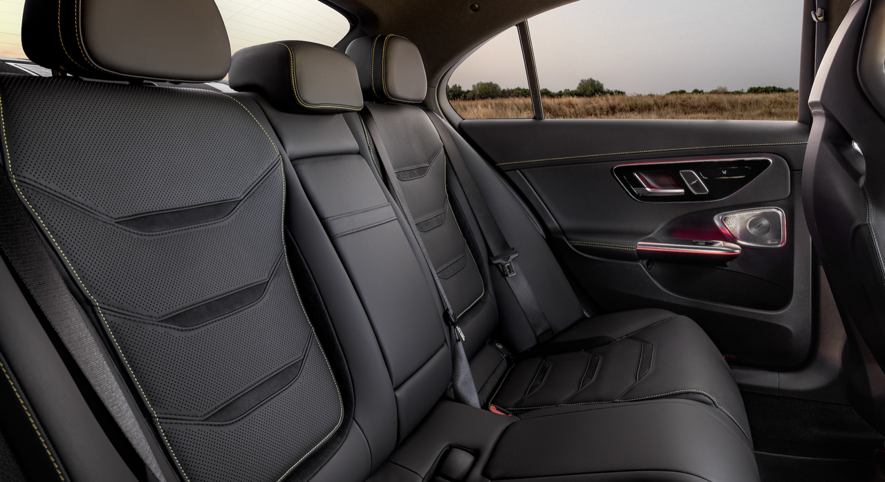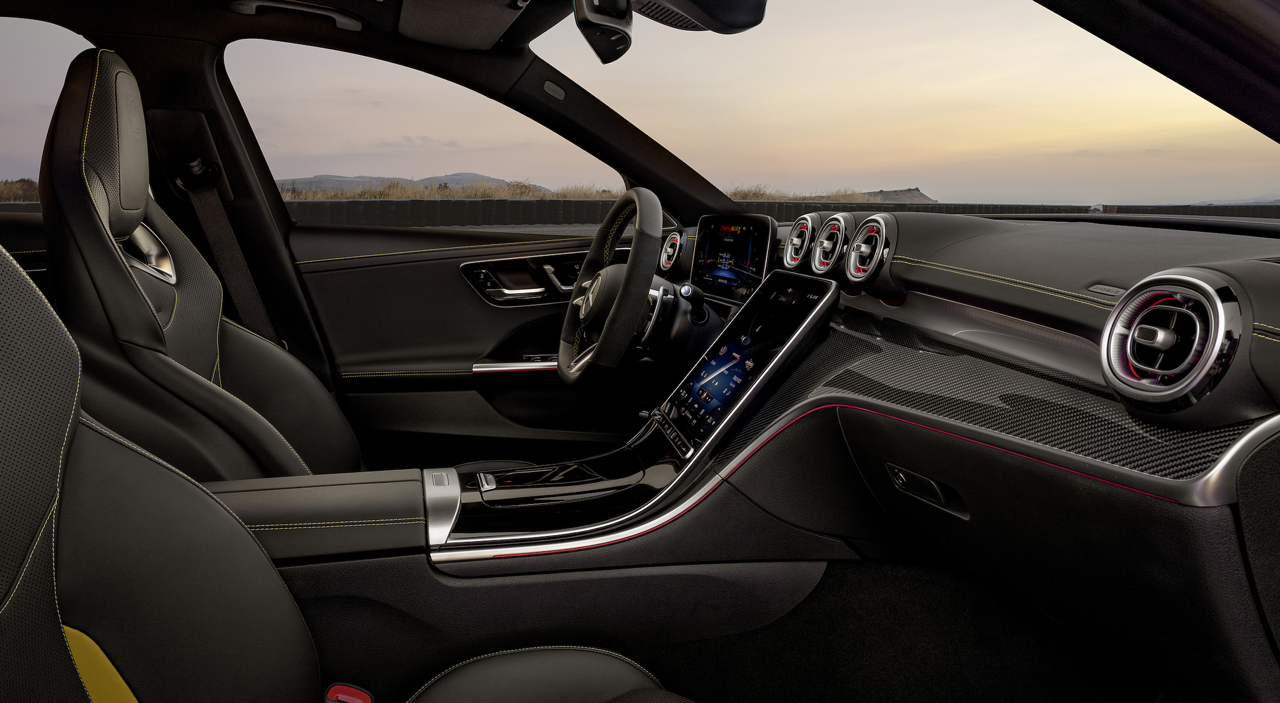 ภายในที่เหมือนกับ New S-Class ของ C63 มีการปรับแต่งระบบอินโฟเทนเมนท์เฉพาะของ AMG รวมถึงตัวจับเวลา การบอกความเร็วต่อรอบในสนามแข่ง และปุ่มเลือกโหมดการขับที่ติดตั้งบนพวงมาลัยพร้อมปุ่มปรับแต่งเฉพาะสำหรับระบบท่อไอเสียและระบบกันสะเทือน เบาะนั่งแบบสปอร์ต AMG ประกอบด้วยส่วนปีกด้านข้างที่ดุดันกว่าเบาะหนังของ C-Class รุ่นมาตรฐาน ช่องเจาะที่พนักพิงและปีกข้างเพื่อการระบายอากาศที่ดีขึ้นและช่วยลดน้ำหนักได้บางส่วน น่าเสียดายที่แผงประตูที่เป็นพลาสติกของ C-Class แบบมาตรฐานยังคงอยู่ใน AMG แต่ AMG นำเสนอสีสันและพื้นผิวของเบาะที่หลากหลาย รวมถึงหนังกลับไมโครไฟเบอร์ และการเย็บแบบใช้โทนสีที่ตัดกัน