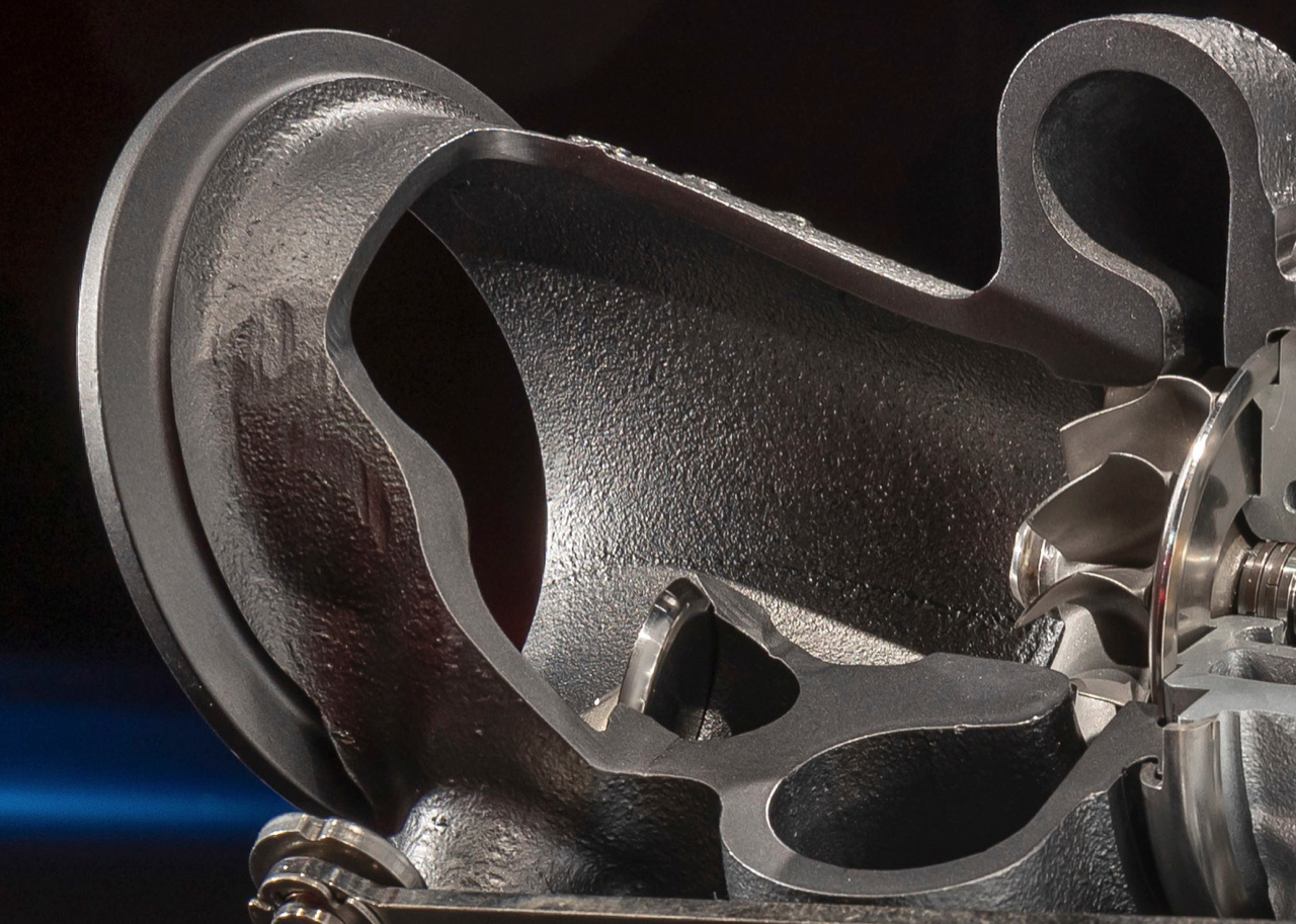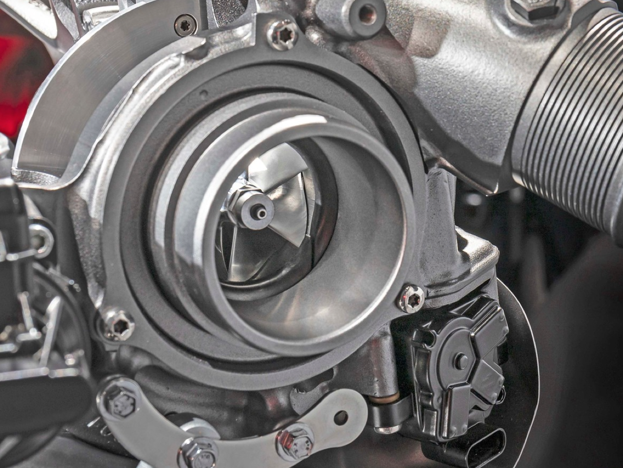 Garrett E-turbo ยังคงใช้ Wastegate แต่ Garrett ทำการปรับแต่งประสิทธิภาพในขั้นตอนการทำงานของกังหันเทอร์ไบน์ เนื่องจากทุกๆ รายละเอียดของการบีบอัดกำลังอัตราส่วน 221 แรงม้า/ลิตร ในรถคันเล็ก มีผลลัพธ์ที่ยากต่อการผลิตจริง เพื่อลดอาการแลค หรืออาการรอรอบของเทอร์โบ วาล์วก้านสูบของเวสต์เกตภายใน มีพื้นผิวทำมุมเหมือนที่คุณเคยเห็นบนวาล์วไอดีและวาล์วไอเสีย ปรับปรุงการรั่วไหลของก๊าซไอเสียให้น้อยลง ก๊าซไอเสียทั้งหมดไหลอย่างรวดเร็วไปที่ครีบเทอร์ไบน์ การวางตำแหน่งที่ทำให้ไอเสียไหลได้อย่างสะดวก ปรับปรุงประสิทธิภาพของกังหันเทอร์ไบน์ใหม่ การออกแบบส่วนสุดท้ายที่ช่วยในเรื่องประสิทธิภาพของกังหันคือตัวกระจายลมแบบมุมแคบ สำหรับการคายประจุของกังหัน การทำมุมแคบนั้นต้องใช้พื้นที่ ซึ่งก็คือสาเหตุที่ทำให้ตัวเทอร์ไบน์ยาวมากขึ้น คุณลักษณะสุดท้ายประการหนึ่งของ E-turbo คือช่วยให้สามารถใช้ turbine housing A/R ขนาดใหญ่ขึ้น เพื่อลดแรงดันย้อนกลับของไอเสีย โดยปกติ โครงสร้างกังหัน A/R ที่ใหญ่ขึ้น จะเพิ่มเวลาและความล่าช้าของแกนอย่างมีนัยสำคัญ แต่มอเตอร์ไฟฟ้าที่ติดตั้งอยู่กับแกนเทอร์ไบน์ จะชดเชยสิ่งที่สูญเสียไปให้ดีกว่าเดิม