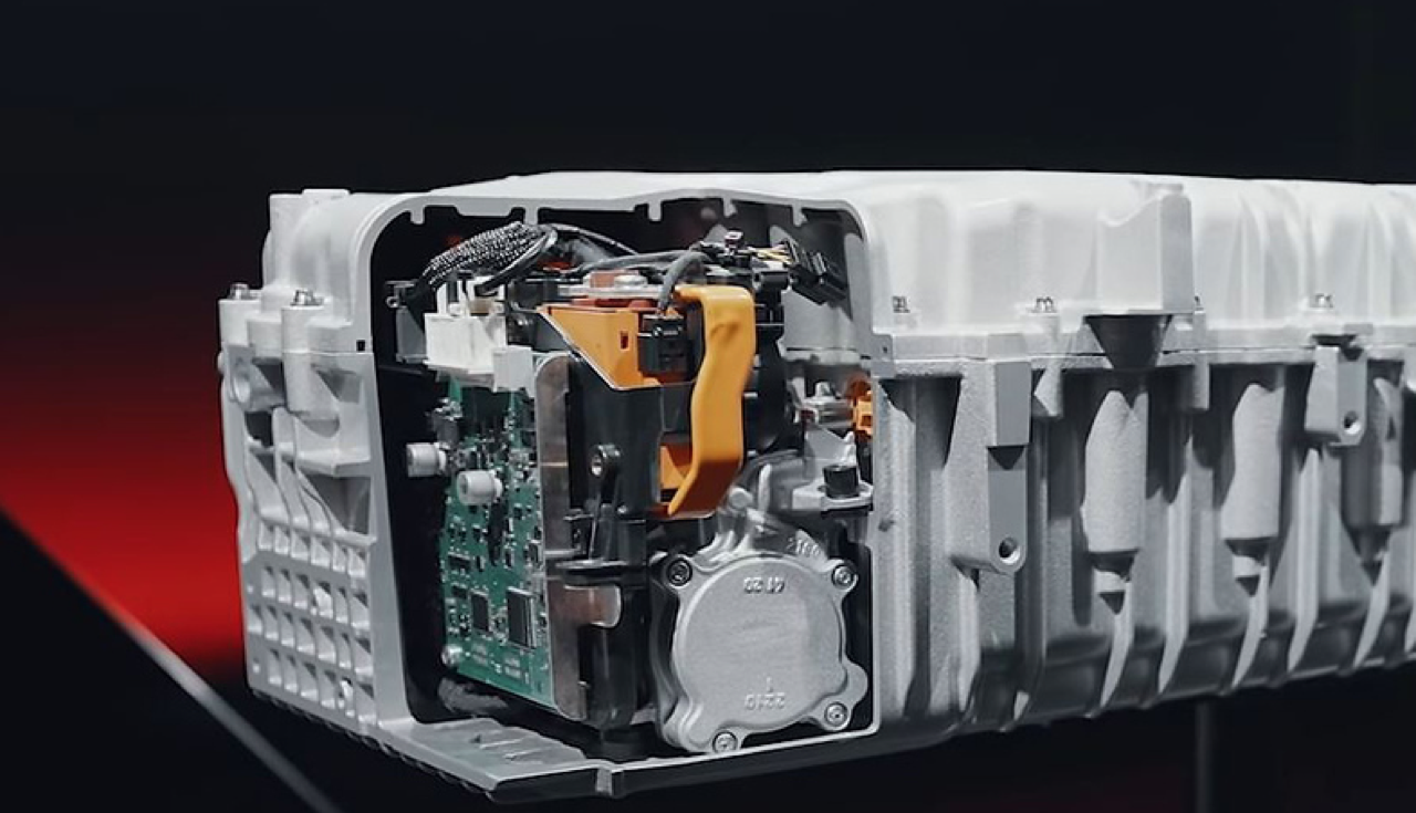 ปั๊มหล่อเย็นและอุปกรณ์อิเล็กทรอนิกส์อยู่ที่ปลายด้านหนึ่งของกล่องแบตเตอรี่อะลูมิเนียม ดูเหมือนว่าจะอยู่ในช่องแยกจากเซลล์แบตเตอรี่และไม่ได้แช่อยู่ในน้ำหล่อเย็น ตัวเฟรมอะลูมิเนียมนั้นดูเหมือนหล่อขึ้นรูปด้วยทราย โดยมีครีบระบายความร้อนอยู่ด้านนอกเพื่อความแข็งแรงและพื้นผิวสำหรับการถ่ายเทความร้อน (ครีบ) ความแข็งแกร่งเป็นสิ่งสำคัญในสถานการณ์ที่เกิดการชน เพื่อป้องกันความเสียหายต่อเซลล์แบตฯ ซึ่งอาจเป็นสาเหตุทำให้เกิดไฟไหม้ เมื่อเซลล์แบตเตอรี่ลิเทียมไอออนติดไฟ โดยทั่วไปจะเผาไหม้จนไม่เหลือสิ่งใด คุณไม่สามารถตัดออกซิเจนได้เพราะลิเทียมทำหน้าที่เป็นตัวออกซิไดเซอร์ที่เผาผลาญอย่างรวดเร็วและรุนแรงเอาเรื่อง