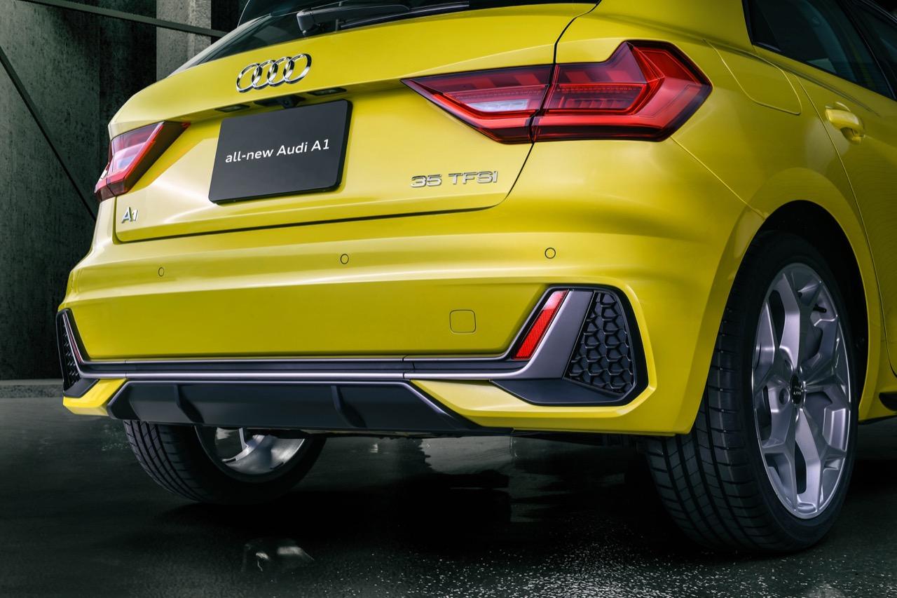 รถเล็กรุ่นขายดีของแบรนด์สี่ห่วง ออกแบบให้ตัวถังภายนอกดูมีมัดกล้าม เน้นเส้นสายรอบตัวถังที่คมชัด เพิ่มความดุดันด้วยชุดแต่ง S line New A1 มีขนาดยาวขึ้นจากรุ่นก่อนหน้า 56 มิลลิเมตร โดยมีความยาวทั้งสิ้น 4,003 มิลลิเมตร ความสะดวกสบายในห้องโดยสารมากขึ้น เนื่องจากขนาดความกว้างของตัวถังเพิ่มเป็น 1,740 มิลลิเมตร ความสูง 1,410 มิลลิเมตร ออกแบบตามหลักอากาศพลศาสตร์ ขยายฐานล้อกว้างขึ้นเพื่อเพิ่มพื้นที่ภายใน ปรับโอเวอร์แฮงก์ให้สั้นลงเพื่อความคล่องตัว ออกแบบกระจังหน้าแบบชิ้นเดียวที่กว้างเท่ากับช่องใต้ฝากระโปรง เป็นแนวคิดการผสมผสานการออกแบบของรถยนต์ Audi ในรุ่น Ur-quattro และ Sport quattro