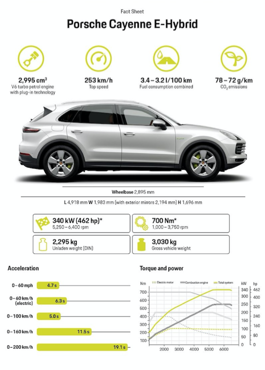 Cayenne plug-in hybrid เร่งออกตัวจาก 0 ถึง 100 กิโลเมตรต่อชั่วโมงใน 5.0 วินาที ความเร็วสูงสุด 253 กิโลเมตรต่อชั่วโมง new Cayenne E-Hybrid เดินทางได้ 441 กิโลเมตร และทำความเร็วได้ถึง 135 กิโลเมตรต่อชั่วโมง เมื่อขับเคลื่อนด้วยพลังงานไฟฟ้าเพียงอย่างเดียว อัตราสิ้นเปลืองน้ำมันเชื้อเพลิงเฉลี่ยเมื่อวัดตามมาตรฐาน New European Drive Cycle (NEDC) โดยขึ้นอยู่กับขนาดของยางรถยนต์ที่ติดตั้งอยู่ที่ 29.4 – 31.2 กิโลเมตรต่อลิตร หรือ 3.4 – 3.2 ลิตรต่อระยะทาง 100 กิโลเมตร อัตราการใช้พลังงานไฟฟ้าที่ 20.9 – 20.6 กิโลวัตต์ชั่วโมง ต่อระยะทาง 100 กิโลเมตร นอกจากการเปิดตัว Cayenne E-Hybrid ค่าย Porsche เพิ่มเติมอุปกรณ์อำนวยความสะดวกและระบบช่วยเหลือการขับขี่หลากหลายรายการให้แก่ Cayenne ทุกรุ่น เช่น หน้าจอ แสดงข้อมูล head-up display แบบใหม่ เบาะนวดไฟฟ้า และล้ออัลลอยน้ำหนักเบาขนาด 22 นิ้ว
