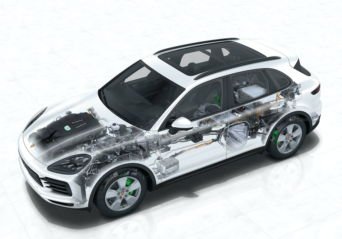 E-Hybrid ชาร์จพลังงานผ่านระบบ Porsche Connect app และ Porsche Charging Service แบตเตอรี่ที่ติดตั้งใน Porsche Cayenne E-Hybrid เพิ่ม ความจุในการเก็บสะสมพลังงาน เสริมขีดความสามารถในแง่ของพิสัยระยะการเดินทางและกำลังสำรองเมื่อต้องการอัตราเร่ง เมื่อเปรียบเทียบกับ Cayenne Hybrid  รุ่นก่อนหน้า พบว่าความจุแบตเตอรี่เพิ่มขึ้นจาก 10.8 เป็น 14.1 กิโลวัตต์ชั่วโมง หรือคิดเป็นสัดส่วนประมาณ 30 เปอร์เซ็นต์ แบตเตอรี่ติดตั้งระบบระบายความร้อน fluid-cooled บริเวณพื้นตัวถังด้านท้าย ประกอบด้วยโมดูลพลังงาน 8 ชุด ภายใน แต่ละโมดูล คือเซลล์ prismatic lithium ion จำนวน 13 เซลล์ สามารถชาร์จแบตเตอรี่จนเต็มความจุภายในระยะเวลา 7.8 ชั่วโมง ด้วยไฟฟ้าแรงดัน 230 โวลต์ ผ่านสายต่อขนาดกระแส 10 แอมป์ ในกรณีที่ใช้อุปกรณ์พิเศษ on-board charger 7.2 กิโลวัตต์ ด้วยไฟฟ้าแรงดัน 230 โวลต์ ผ่านสายต่อขนาดกระแส 32 แอมป์ แทนที่ระบบชาร์จมาตรฐานแบบ 3.6 กิโลวัตต์ แบตเตอรี่จะได้รับการชาร์จพลังงานจนเต็มความจุภายในเวลา 2.3 ชั่วโมง