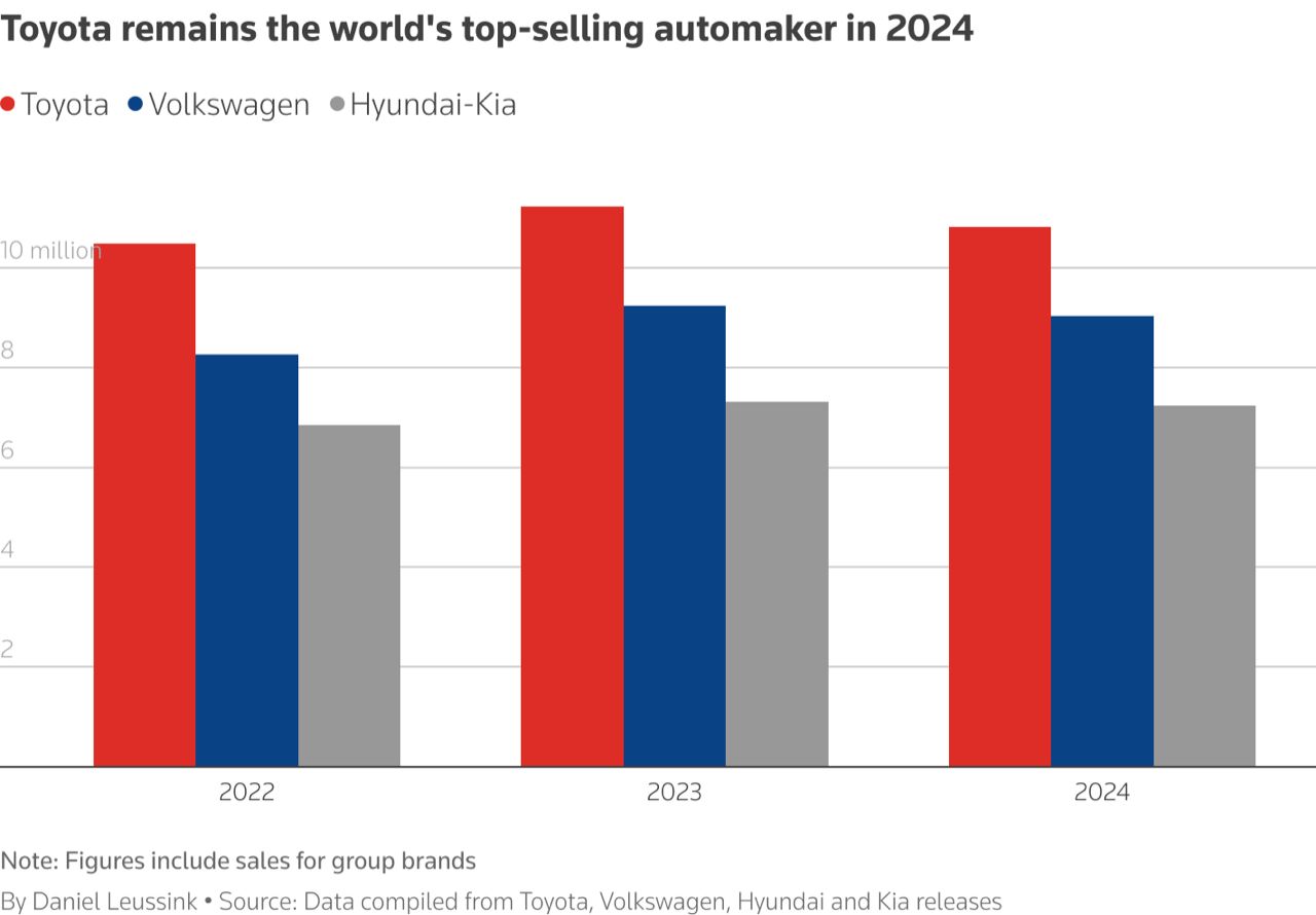 Hyundai Motor ซึ่งประกอบด้วยแบรนด์หลักอย่าง Hyundai Kia และ Genesis มีแนวโน้มที่จะขึ้นแท่นบนโพเดียม หลังจากทำยอดขายได้ 7.23 ล้านคัน ในปี 2024 หรือลดลง 1% จากปี 2023.