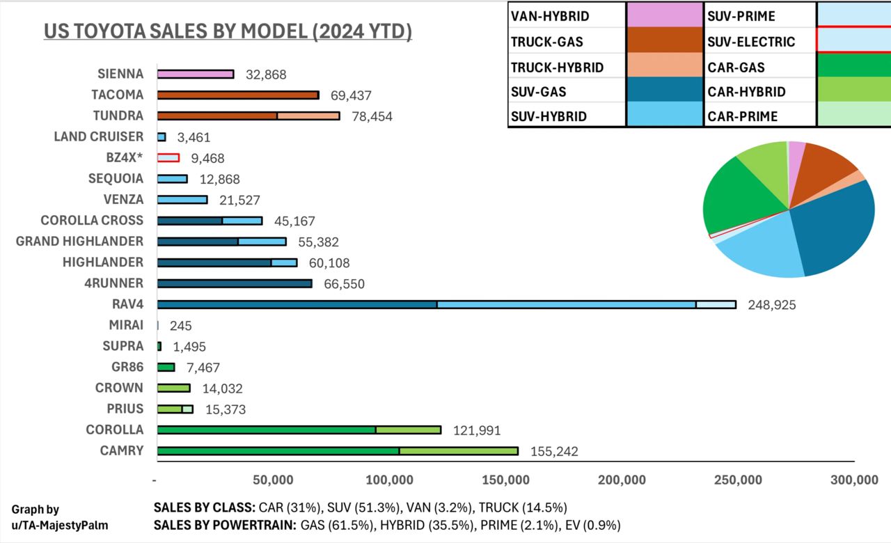 Toyota มียานยนต์ๆไฟฟ้าให้เลือกแค่ 3 รุ่น (Toyota bZ4X / Lexus RZ450e / Lexus UX300e ) แต่รถยนต์เครื่องยนต์สันดาปภายใน ที่มีให้เลือกทั้งไฮบริดและปลั๊กอินไฮบริด ทำให้ผลิตภัณฑ์ยานยนต์ของ Toyota เข้าถึงลูกค้าทั่วทุกมุมโลกได้อย่างง่ายดายสะดวกโยธิน พี่โตผลิตรถยนต์ที่มีความหลากหลายมากกว่า และตรงกับความต้องการของลูกค้าทั่วโลก ตั้งแต่รถยนต์ขนาดเล็ก ไปจนถึงรถยนต์ SUV ขนาดใหญ่ แทบไม่มีช่องว่างในผลิตภัณฑ์ของ Toyota ทั้งรถเก๋ง สเตชั่นแวกอน รถบรรทุก มินิแวน และรถยนต์สมรรถนะสูง ทุกรุ่นที่ผลิตออกมาขายก็ทำตลาดได้ดีเกือบทั้งหมด