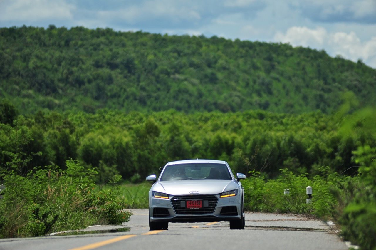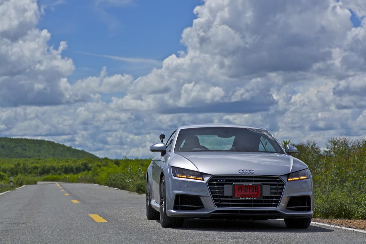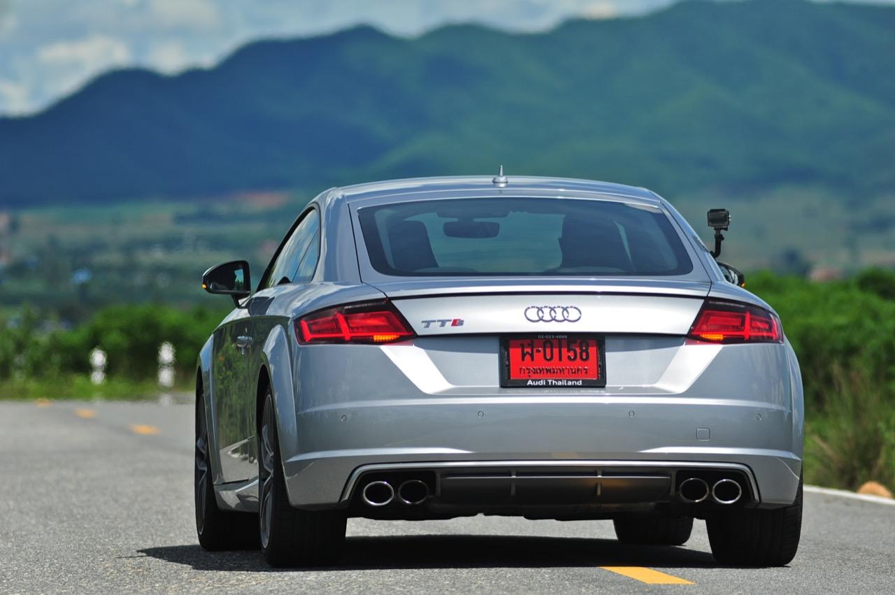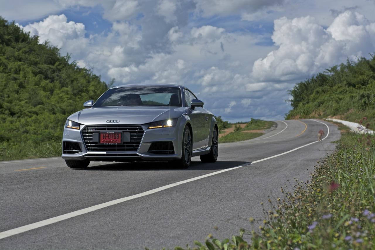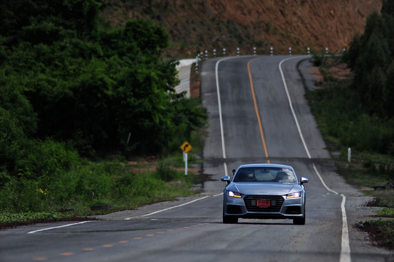 Audi TTS เป็นรถสปอร์ตคันเล็กที่คุณจะเบรก เลี้ยว และเร่งออกจากโค้งได้ดั่งใจ มันมีแรงยึดเกาะที่สูงเอาเรื่อง ทรงตัวในโค้งดีกว่า C43 หรือแม้แต่ M2 คุณสามารถหักเลี้ยวได้อย่างเฉียบคมจากการตอบสนองของหลายระบบที่หล่อหลอมให้ TTS มีประสิทธิภาพตามที่คุณต้องการ ยางติดรถ Hankook Ventus V2 ขนาด 245/35 R19 ตอนรับรถมาพอเห็นยี่ห้อยางเข้าก็เริ่มออกอาการไม่มั่นใจ แต่พอได้ลองแล้วเอามาอัดแรงๆในโค้ง กริ้บของ Ventus V2 นั้นถือว่าใช้ได้เลยทีเดียว แต่ถ้าจะให้มั่นใจมากกว่านี้ขอเป็น Pilot Sport Cup 2 จะสุดกว่านี้มาก! ความท้าทายในวันทดสอบก็คือกลุ่มเมฆฝนที่ไล่หลังมาติดๆ และการขับไปให้ไกลมากที่สุดเพื่อหาโลเคชั่นเงียบๆบันทึกภาพ การขับ Audi สปอร์ตท่ามกลางป่าเขาลำเนาไพรให้ความรู้สึกแปลกประหลาดเนื่องจากเจ้าของ TT ส่วนใหญ่ใช้มันขับไปช็อปปิ้งหรือรับแฟนไปดูหนังทานข้าวตามห้างดังๆ มากกว่าจะมาห้อเต็มสูบอยู่ใจกลางป่าลึกแบบนี้