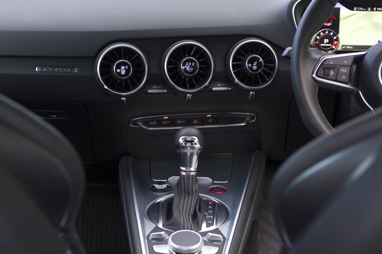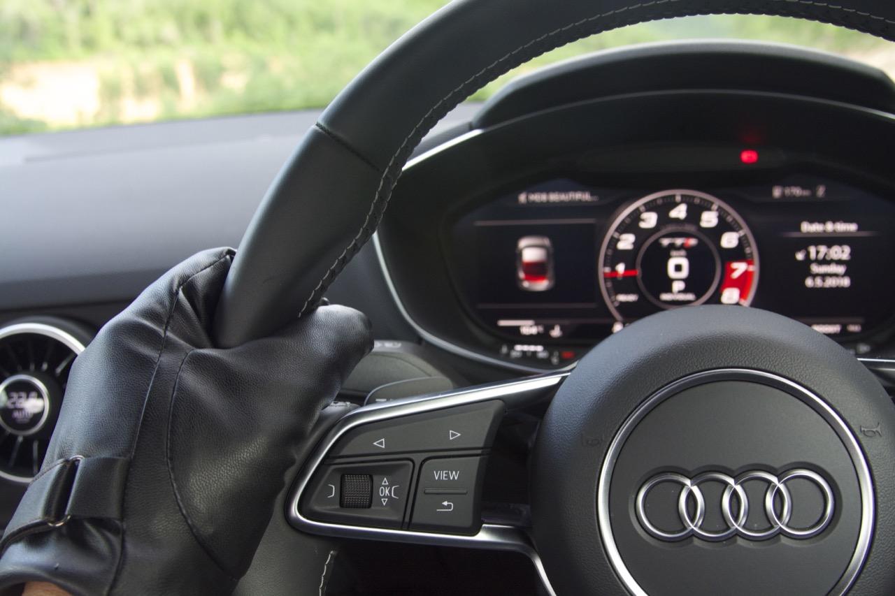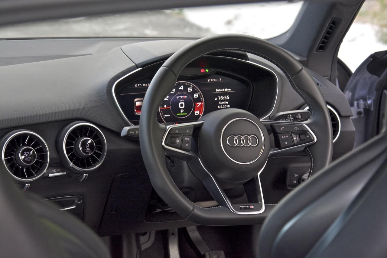 พวงมาลัยทรงสามก้านฐานตัดแบบรถแข่งหุ้มด้วยหนังแท้พร้อมกริ้บที่ออกแบบให้เข้ากับร่องนิ้ว ทำให้ยึดจับพวงมาลัยได้อย่างถนัดไม้ถนัดมือดีมาก วงพวงมาลัยของ TTS ไม่ใหญ่หรือเล็ก โดยมีขนาดที่พอดิบพอดีเข้ากับรูปแบบป้อมๆ อ้วนๆ ของตัวรถ ก้านวงด้านซ้ายและขวาของพวงมาลัยติดตั้งสวิตช์ปรับตั้งต่างๆ หลังวงพวงมาลัย 3 ก้านยังมีแป้นเปลี่ยนเกียร์ Paddle Shift แต่มีขนาดเล็กไปนิดไม่ค่อยเหมาะสมกับความเป็นรถแรงในรุ่น S แป้นเปลี่ยนเกียร์หลังวงพวงมาลัย Paddle Shift แม้จะมีขนาดที่เล็กแต่ก็ให้สัมผัสในการใช้งานที่มีความแน่นอนแม่นยำ รวมถึงยังมีระยะของการกดกระชับมากขึ้น