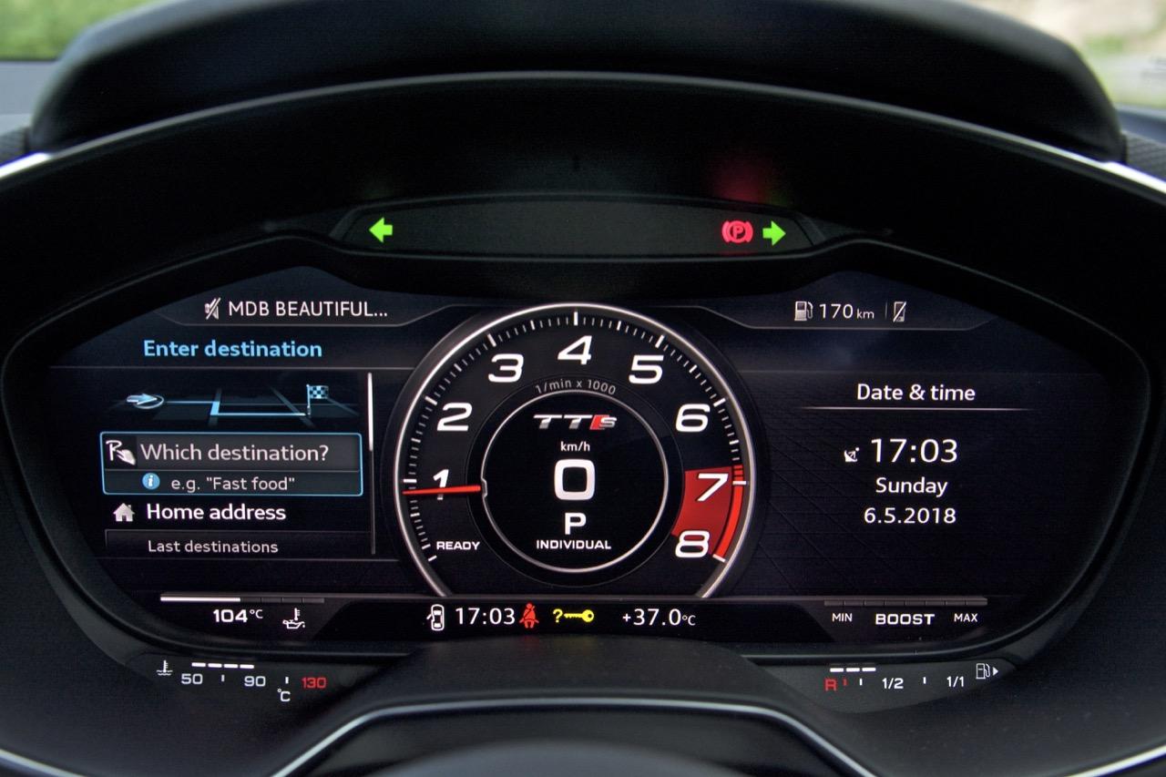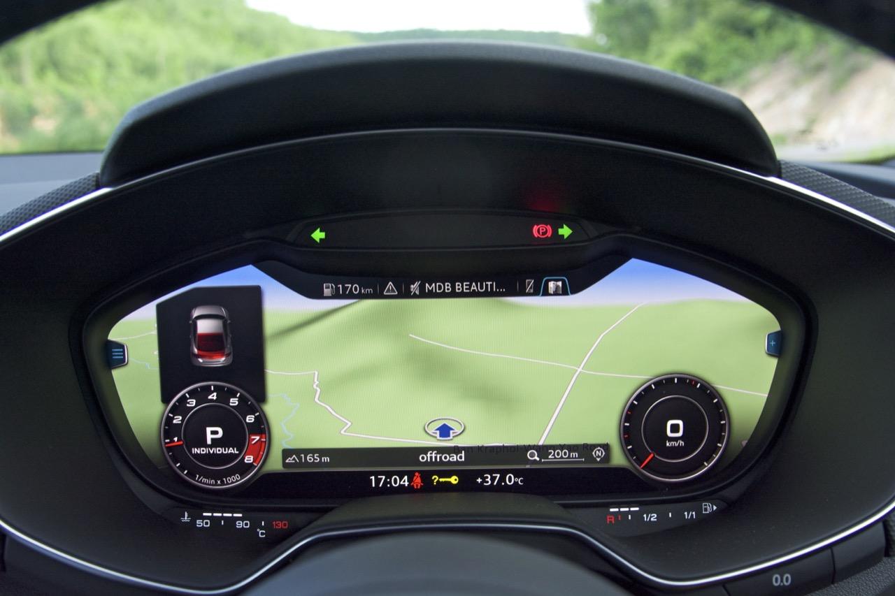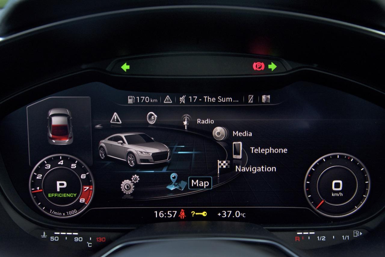 เข็มความเร็วและวัดรอบจะมีขนาดที่ใหญ่ขึ้นแบบการแสดงภาพที่คมชัดมาก จอระบบนำทางเล็กๆ อยู่ตรงกลางหรือหากไม่ชอบก็สามารถเลื่อนเปลี่ยนได้ ผู้ขับขี่สามารถปรับขนาดของมาตรวัดในจอภาพให้เป็นไปตามที่ต้องการ หรือแสดงผลจอภาพทั้งหมดด้วยระบบนำทางและกำหนดพิกัดผ่านดาวเทียม จอภาพทันสมัยขนาด 12.3 นิ้ว ในหน้าปัดมาตรวัดแบบใหม่ของ TT ยังมีลูกเล่นอื่นๆ อีกเพียบ การใช้งานท่ามกลางเทคโนโลยีที่แปรเปลี่ยน ทำให้ค่ายผู้ผลิตรถยนต์ต้องคิดค้นหาวิธีผูกมัดใจคนซื้อให้อยู่หมัดด้วยของเล่นแปลกๆ ที่ทันสมัย มาตรวัดแบบ TFT หรือ thin film transistor ถูกใช้งานอย่างกว้างขวางในรถระดับสูง เช่น Lamborghini / Mercedes Benz / BMW / Ferrari รวมถึง Honda และ Volvo ซึ่งต่างฝ่ายต่างก็พยายามสร้างสรรค์งานศิลปะที่น่าใช้งาน โดยนำมาประดับประดาในรถรุ่นใหม่ด้วยการทำงานราวกับนักมายากล Virtual Cockpit ของ New TT ยังสามารถแสดงค่าต่างๆ ของตัวรถ รวมถึงการโชว์ระบบ Infotainment ด้วยความคมชัดสูงสุด หน้าปัดและแดชบอร์ดต่างๆ ถูกออกแบบมาเพื่อสร้างความรู้สึกถึงการควบคุมจักรกลพลังสูงอย่างแท้จริง