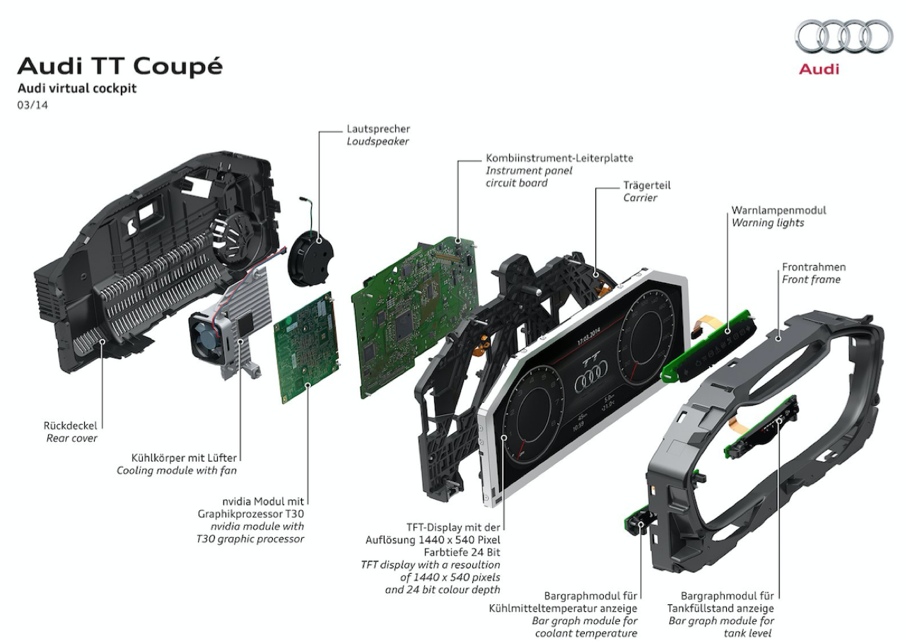 แบรนด์ Audi ผู้ผลิตรถยนต์สัญชาติเยอรมนี คือ ค่ายรถเจ้าแรกที่นำเทคโนโลยี Virtual Cockpit มาใช้งานในรถสปอร์ตรุ่น TT ช่วยให้ห้องโดยสารยุคใหม่มีปุ่มควบคุมที่ลดลงช่วยลดภารกรรมของคนขับในการปรับตั้งค่าต่างๆ ระบบรับคำสั่งแบบ Voice Command รับคำสั่งด้วยเสียงแบบง่ายๆ Virtual Cockpit จาก Audi พัฒนาโดย Andre Ebner โดยย่อหน่วยความจำในส่วนของสมองกลไฟฟ้าที่ใช้ควบคุมให้เล็กลงเพื่อใช้งานในรถยนต์รุ่นใหม่ การออกแบบภายในและจัดวางอุปกรณ์ที่เน้นความเท่ เคร่งขรึมด้วยโทนสีเทาดำตัดกับวัสดุอัลลอยสีเงิน คอนโซลแดชบอร์ดเดินเส้นสายโปร่งเบาพลิ้วไหว ช่วยสื่อความเป็นรถสปอร์ตของ New TT ได้เป็นอย่างดี