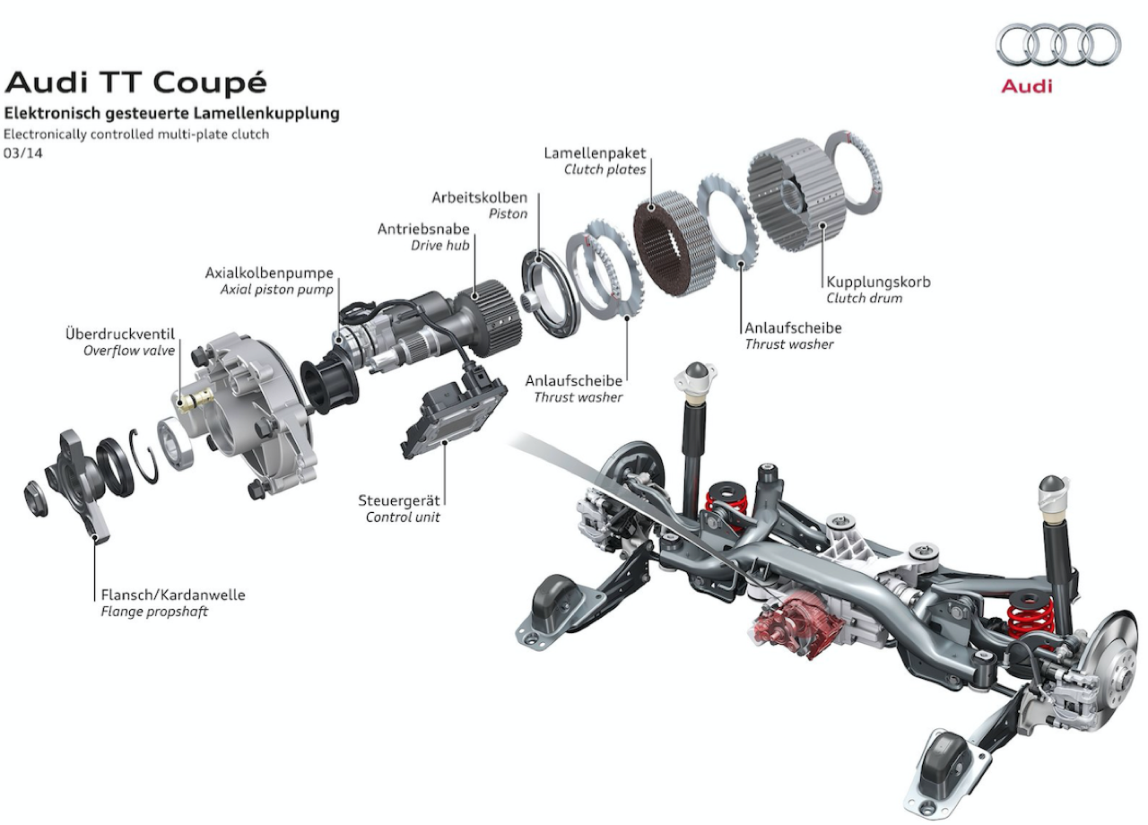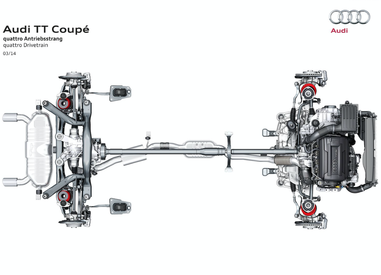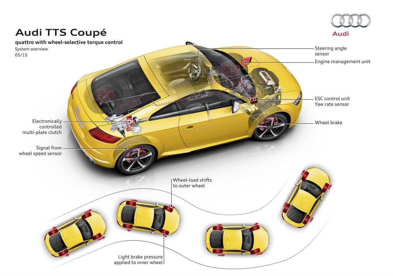 ประสิทธิภาพที่โดดเด่นกว่ารถคู่แข่งในด้านระบบขับเคลื่อนก็คือ กลไกการขับเคลื่อน 4 ล้อ Quattro ระบบขับเคลื่อนสี่ล้อของ Audi TTS ช่วยเสริมเสถียรภาพและกระจายแรงบิดให้มีความสมดุลสูงสุดเพื่อการยึดเกาะที่ดี ระบบขับเคลื่อนทุกล้อจาก Audi ฝากผลงานไว้มากมายในวงการมอเตอร์สปอร์ต โดยได้รับการพัฒนาให้ก้าวล้ำมากยิ่งขึ้น การปรับปรุงชุดขับ 4 ล้ออย่างต่อเนื่อง โดยเฉพาะระบบคลัตช์แบบหลายแผ่นที่ควบคุมด้วยไฮดรอลิกไฟฟ้า ติดตั้งบนเพลาท้าย ช่วยลดน้ำหนักลงราว 1.5 กิโลกรัม เมื่อเทียบกับรุ่นก่อน นอกจากนี้ การกระจายแรงบิดระหว่างเพลาล้อคู่หน้าและคู่หลังนั้นก็ถูกควบคุมโดยระบบไฟฟ้าที่รวดเร็วเพียงเสี้ยววินาที อัจฉริยภาพของระบบขับเคลื่อนสี่ล้อ Quattro คือซอฟต์แวร์ที่เข้ามาจัดการกระจายแรงบิดระหว่างล้อคู่หน้าและคู่หลังอย่างแม่นยำและเหมาะสม
