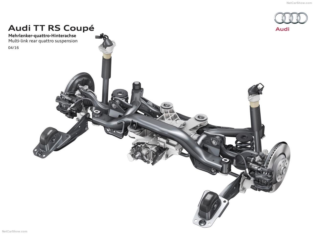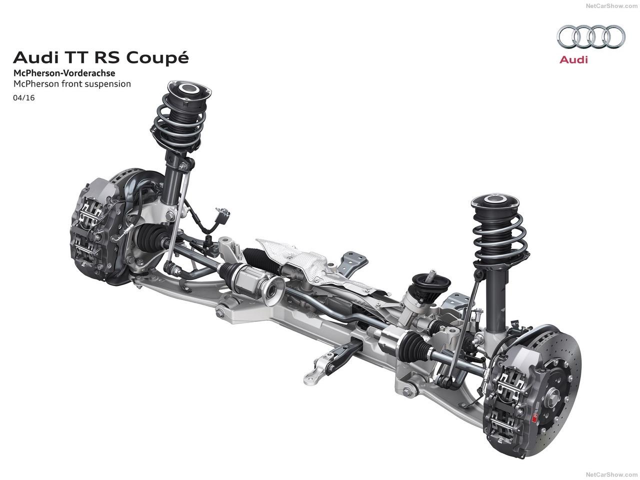ระบบรองรับน้ำหนักของ Audi TTS สะท้อนให้เห็นถึงความเชี่ยวชาญทางวิศวกรรมยานยนต์ของเยอรมัน ระบบกันสะเทือนหน้าแบบ MacPherson โครงสร้างชิ้นส่วนของจุดยึดโยงต่างๆ ทำจากอะลูมิเนียม เข้ามาช่วยลดน้ำหนักใต้สปริง (Unsprung Weight) ทั้งนี้ ระบบกันสะเทือนหลังของ TT ยังเป็นแบบ 4-Link รองรับแรงกดแนวนอน (longitudinal force) และแรงบิดแนวขวาง (transverse force) อย่างเป็นอิสระแยกจากกัน สำหรับชุดบังคับเลี้ยวหรือแรคพวงมาลัย ใช้แบบแรคแอนพีเนียนพร้อมพาวเวอร์ไฟฟ้า ผนวกระบบแปรผันน้ำหนักพวงมาลัย Progressive steering แบบมาตรฐานที่ช่วยเพิ่มการตอบสนองตามสภาพการขับขี่ ตัวแรคพวงมาลัยถูกออกแบบมาเพื่อการตอบสนองโดยตรงต่อระยะของการหมุน ทำให้การควบคุมเกิดความเฉียบคมแม่นยำ